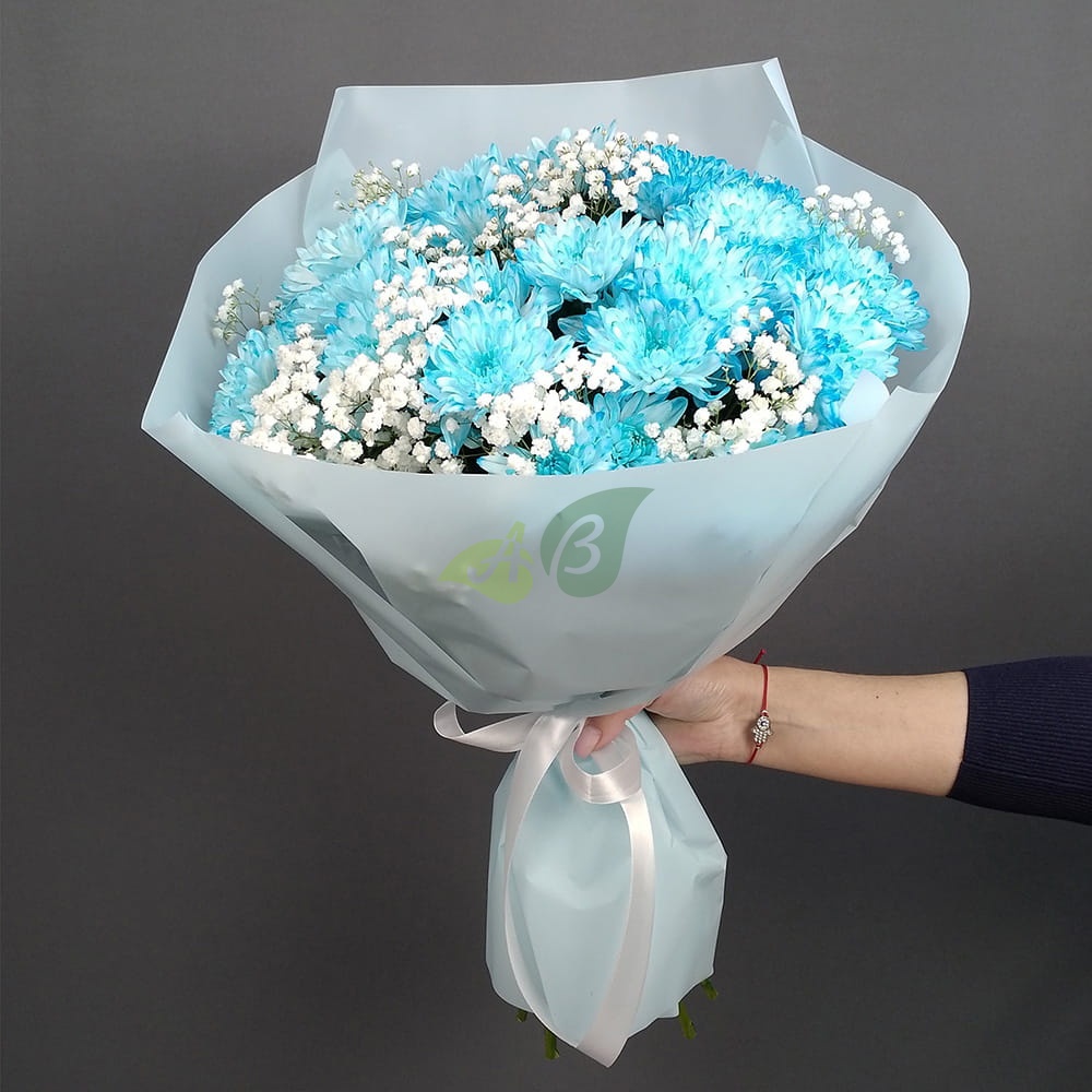Нежно голубые хризантемы и белые гипсофилы можно купить для любимой жены. Напомните ей о том, как сильно вы ее любите, как она вам дорога.